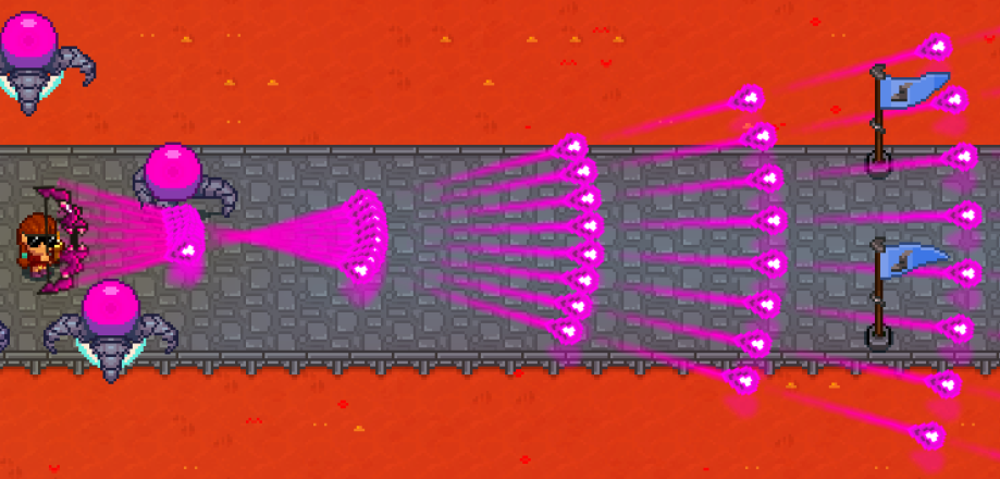 The Arrow form shoots eight arrows that point toward your cursor location, and after passing through that point, spread out again. The cursor is not visible in this screenshot, but it is relatively close to the player, near the orb summon.