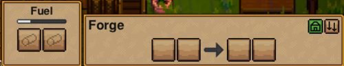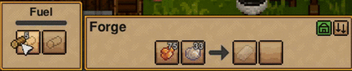 you will notice that there is a space for fuel which is required to use the forge. if you followed along with me you should have a bunch of trees around the elders house you can chop down for fuel. place some Logs in and you are ready to use the forge.